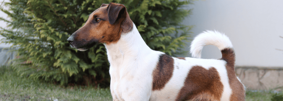 The Smooth Fox Terrier can be described as friendly, energetic and outgoing. They are terrific companions for children as they never tire of playing, so they are suitable for families with an active lifestyle. Their dense, flat coat is mainly white, with black, tan, or black and tan markings. Their head and muzzle is flat, with a V-shaped skull. They are hunters with a strong prey drive, so they love to play fetch and dig in the yard- often described as outgoing and inquisitive creatures, and loving and affectionate family members.